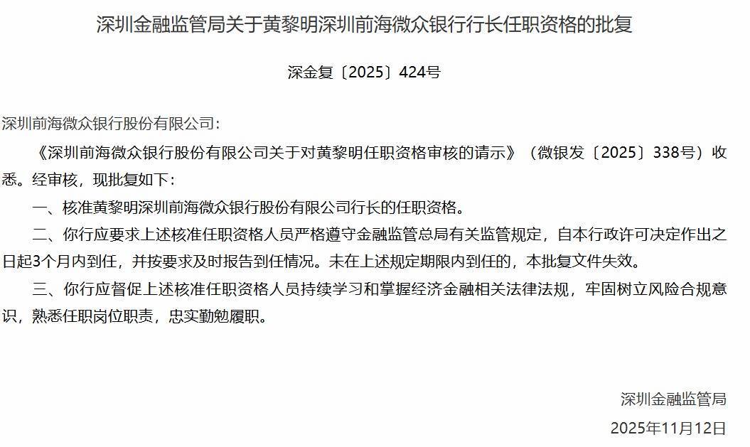 《批复》截图。《批复》条目,核准任职经验东说念主员严格顺从金融监管总局联系监管章程,自本行政许可决定作出之日起3个月内到任,并按条目实时申报到任情况。未在上述规依期限内到任的,本批复文献失效。同期条目微众银行应督促上述核准任职经验东说念主员不绝学习和掌执经济金融联系法律法则,巩固建设风险合规意志,熟识任职岗亭职责,古道贫窭履职。